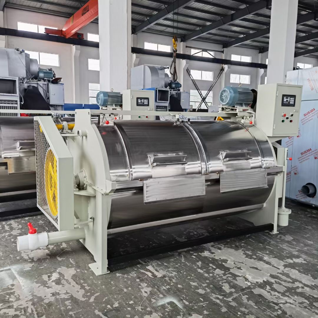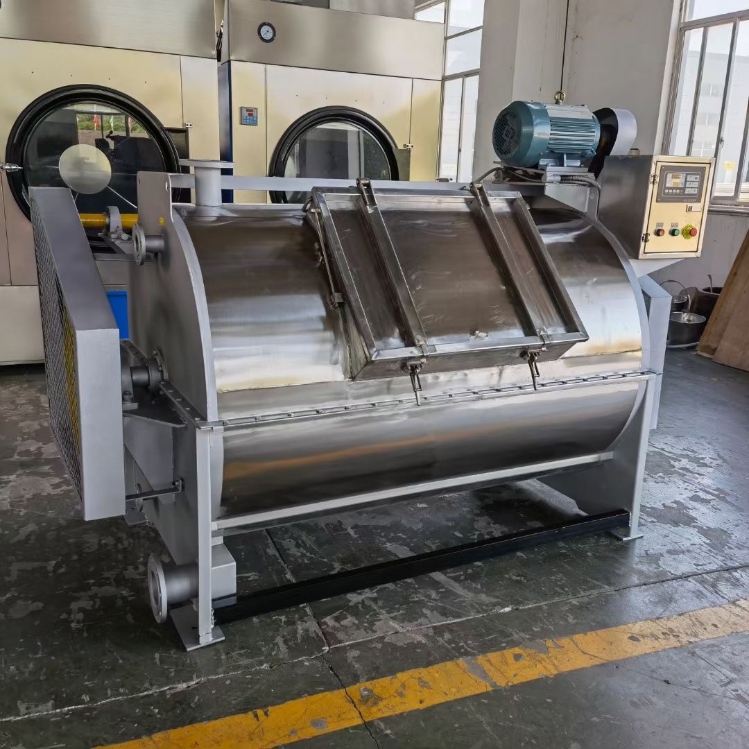 工业洗衣机:按容量大小分为:15kg、30kg、50kg、70kg、100kg、150kg、200kg等系列。该设备是滚筒型,内、外壳采用优质不锈钢制作而成,平整光滑、耐腐蚀、不损伤织物。该机由内筒、外筒、电机、支撑总成、传动总成、电器总成组成。结构合理、安装使用方便。工作原理:由顶置电机、三角胶带、带动传动总成,使内筒作正反转运转,通过织物与织物、织物与内筒壁的相互摩擦,达到洗涤效果。机器内置过热、过载装置、定时装置、正反转控制装置。外筒门设有安全装置,若运行中门被打开,机器立即停止运转,确保机器、操作人员的安全。