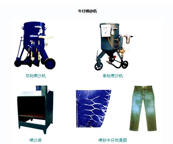 1.牛仔喷砂机是空压机的压缩空气为动力,用喷枪将金刚砂直接喷射到牛仔裤上,使牛仔裤起到粗化、发白的效果。并可用模板制成顾 客需求的美丽图案进行喷砂。完成一件牛仔裤仅需几秒钟时间。本机结构合理,操作方便,成本低、产量大。广泛适用于国内各中小型服装厂使用。